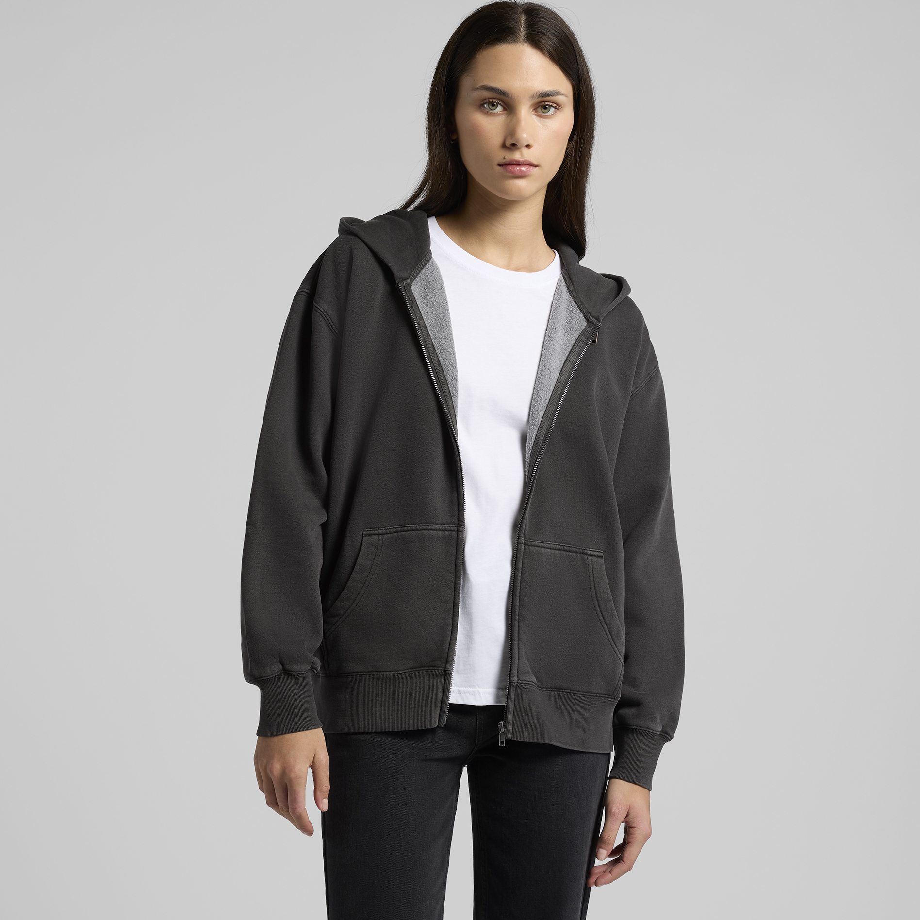Construction: Garment dyed, zip hood, drop shoulder, kangaroo pocket, self-fabric lined hood, no drawcord, SBS two-way zip, sleeve cuff ribbing, CVC fleece, preshrunk to minimise shrinka